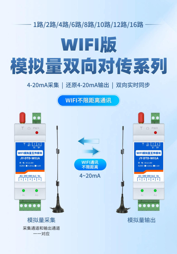 在无线 WiFi 互传模块的大家族中,模拟量对传模块是极具针对性的,区别于普通数据传输模块,核心优势在于能精准捕捉温度、压力、电流等连续变化的模拟信号,经过数字化转换后实现双向稳定传输,无需复杂布线即可解决传统有线模拟量传输的距离限制与干扰问题。如今,模块已深度渗透到工业生产、智慧农业、智能安防等多个领域,用 “无线精准传感” 的能力,为各行业的智能化升级提供核心支撑。